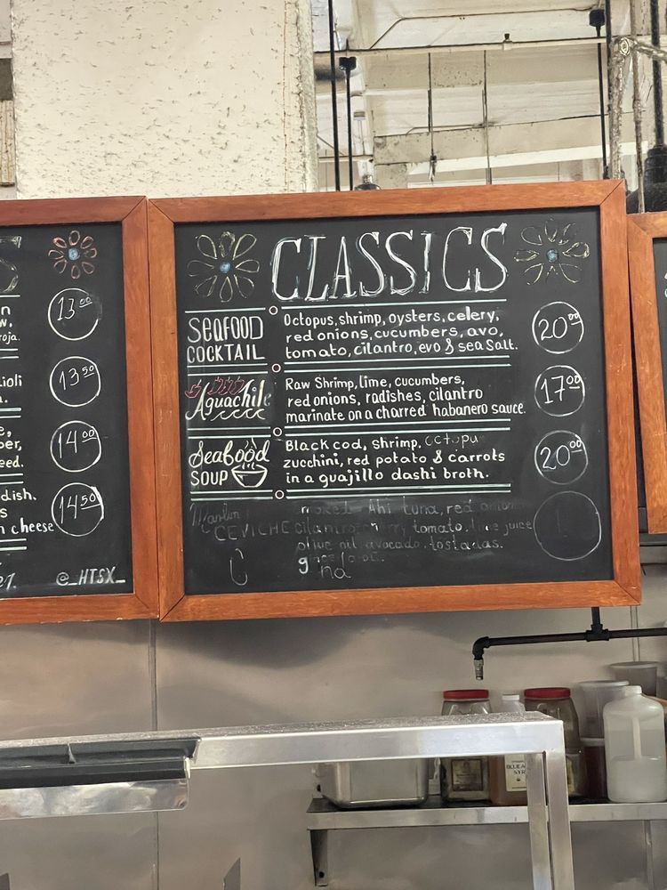 Chilled shrimp, serrano, cucumber, red onions, celery, parsley, cilantro, lime juice and sea salt.